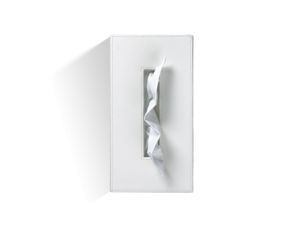 Luxusní box na kapesníčky v odstínu BÍLÁ. Materiál je imitace kůže. Výška 8 cm, délka 24 cm, šířka 12 cm.