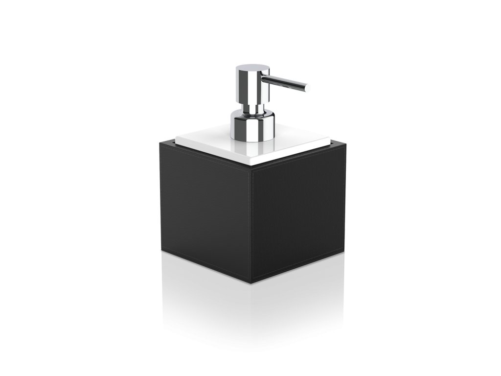 Dávkovač mýdla v odstínu černá . Materiál imitace kůže v kombinaci s porcelánem a chromem. Výška 14,7 cm, délka 9,9 cm, šířka 9,9 cm.