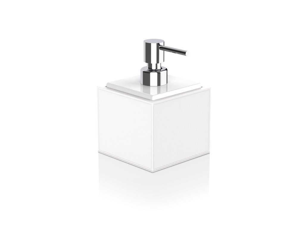Dávkovač mýdla v odstínu bílá. Materiál imitace kůže v kombinaci s porcelánem a chromem. Výška 14,7 cm, délka 9,9 cm, šířka 9,9 cm.