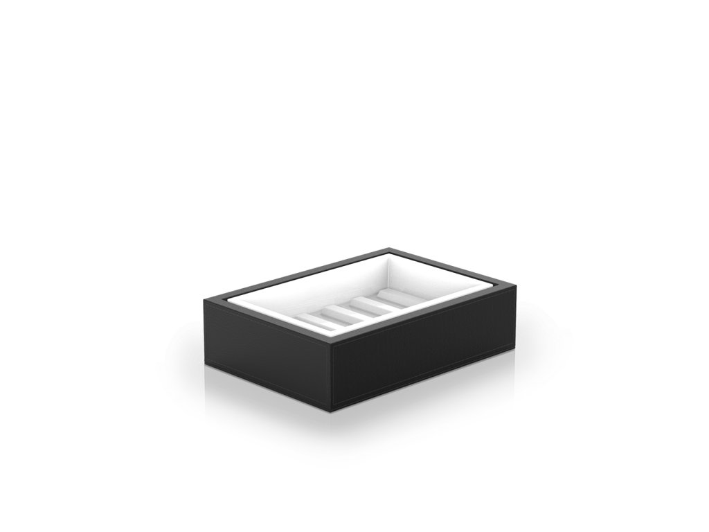 Designový mýdelník v odstínu černá. Materiál imitace kůže v kombinaci s porcelánem. Výška 3,7 cm, délka 13 cm, šířka 9,5 cm.