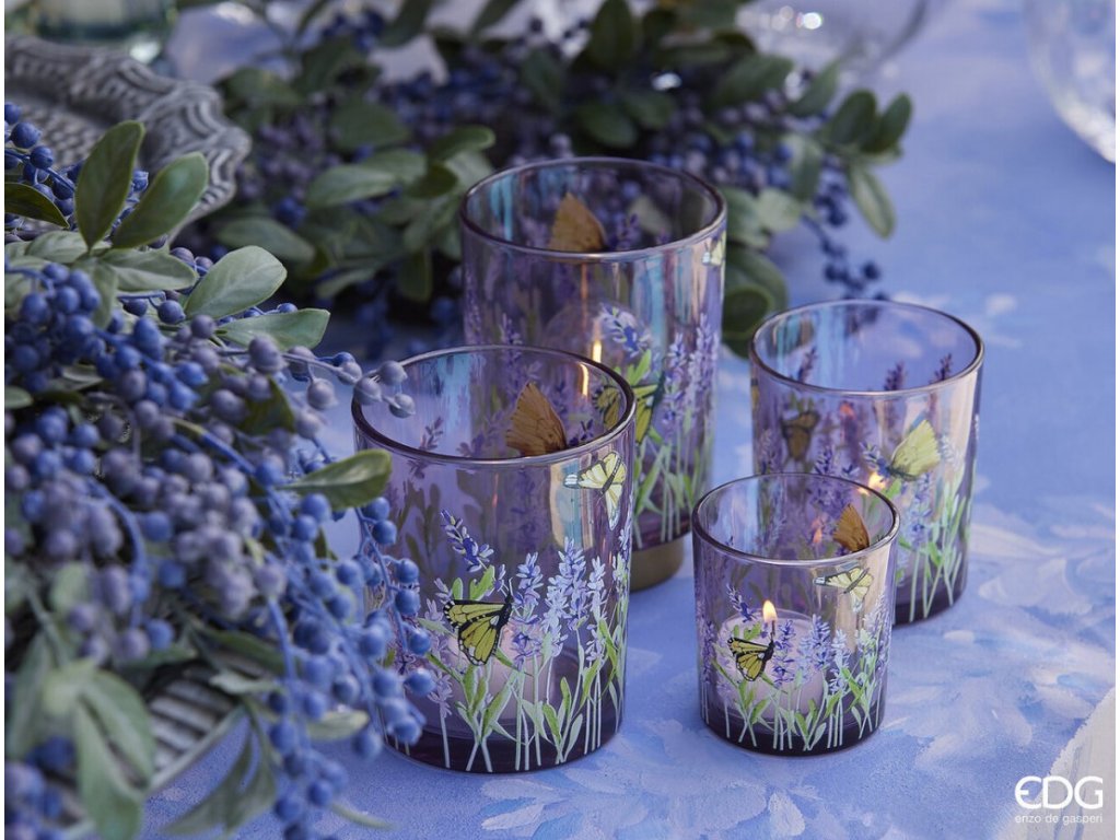 Stylový skleněný svícen s fialovými levandulemi pro letní atmosféru domova. Výška 12 cm, průměr 10 cm.