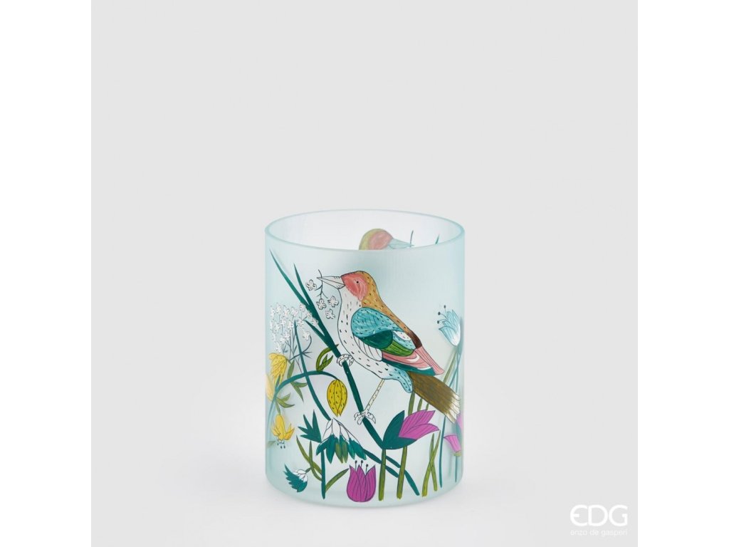 Skleněný svícen s motivem ptáčků. Výška 15 cm, průměr12 cm.