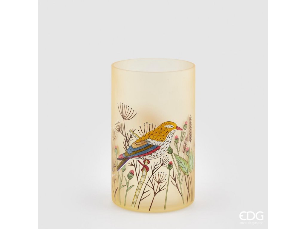 Skleněný svícen s motivem ptáčků rozjasní váš interiér. Výška 20 cm, průměr 12 cm. Barva žlutá.