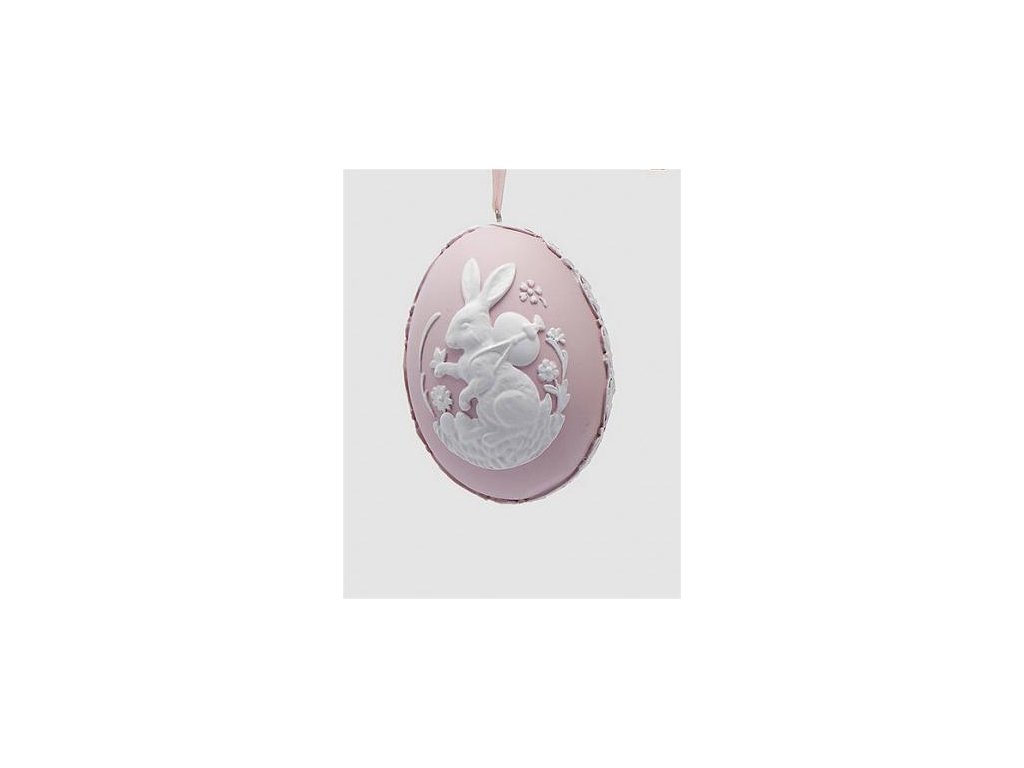 Velikonoční kraslice k zavěšení v jemném růžovém odstínu s reliéfem zajíčka. Materiál plast. Výška 10,5 cm, průměr 7,5 cm.
